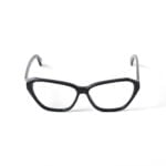Occhiali da vista neri in acetato con logo OFF bianco sull’asta. Montatura cat-eye e lenti con proprietà di blocco della luce blu.
